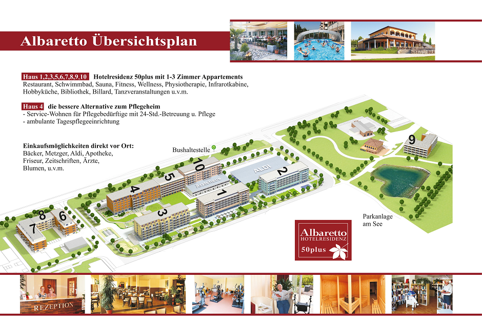 Unser Dienstleistungsangebot umfasst ein Restaurant mit täglich frischen Gerichten, Schwimmbad mit Sauna und Infrarotkabine, eine Physiotherapie-Praxis, Bibliothek, diverse Freizeit- und Sportangebote, Hobbyküche, Tagespflegeeinrichtungen, mehrere ambulante Pflegedienste, Zimmereinigung, Hausmeisterservice, Rezeption, Wäscheservice, uvm.